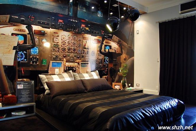 我們看這款設(shè)計(jì),可以感覺(jué)得到業(yè)主對(duì)飛機(jī)的熱愛(ài)到了癡迷的程度,整個(gè)臥室被改造成了駕駛艙,而床頭背景墻的設(shè)計(jì)更是成為了居室的點(diǎn)睛之筆,各種方向盤的設(shè)計(jì),在燈光的照耀下,顯得溫馨而舒適,睡在這樣一個(gè)臥室空間,整個(gè)人就好像漂浮在空中一樣,特別的悠閑自在。整個(gè)空間的色彩并不艷麗,中性的色彩更凸顯出時(shí)尚奢華的感覺(jué)。