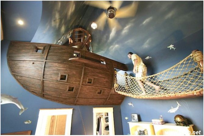 海盜船造型設(shè)計(jì),很難想象吧!有時(shí)候,我們只會(huì)想到豪華汽車有汽車模型、奢華飛機(jī)有飛機(jī)模型,但我們卻沒(méi)有想到將這些模型運(yùn)用到臥室內(nèi)。而這款設(shè)計(jì),設(shè)計(jì)師充分發(fā)揮了想象力,將電影情節(jié)中的海盜船造型運(yùn)用到了居室內(nèi),天馬行空的想象讓我們佩服。這個(gè)海盜船造型的臥室設(shè)計(jì)最大的亮點(diǎn)就是有一個(gè)超級(jí)熱愛(ài)航海的航海員的家,整個(gè)家都充滿了海洋的元素,例如家中的壁紙都具有海洋的味道。在這里,還可以是小孩子的游樂(lè)場(chǎng)所,需要特別注意的是,登上這艘海盜船一定要注意安全,特別是小孩子。