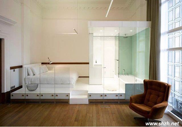 舞臺(tái)造型的臥室設(shè)計(jì),看似開放式的空間,其實(shí)用了玻璃作為隔斷,而且還設(shè)置了白色地臺(tái),巧妙的將各個(gè)功能區(qū)域明顯的區(qū)分了開來(lái)。衛(wèi)浴間的設(shè)計(jì)很美妙,整個(gè)區(qū)域就像一個(gè)舞臺(tái),淋浴時(shí)還能再此高歌一曲,讓自己變得自信滿滿。