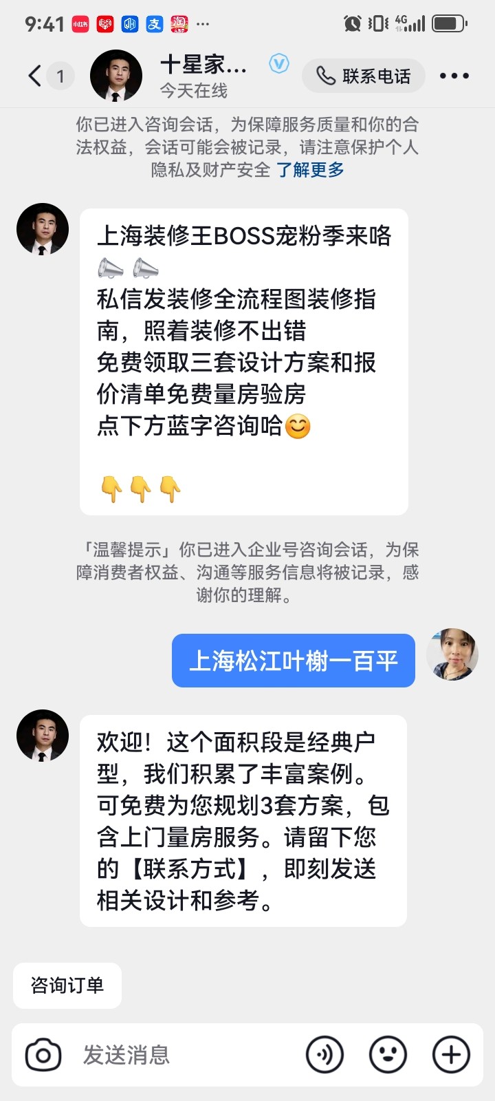 十星企業(yè)服務(wù)(上海)有限公司 (后續(xù)簡(jiǎn)稱,十星)宣傳說(shuō)免費(fèi)量房,出設(shè)計(jì)圖,效果圖。我在12月18日抖音上留了聯(lián)系方式,12月19日就上門(mén)量房,12月21日約我去公司參觀,21日11點(diǎn)到十星松江公司,去公司參觀了一圈,就去了一個(gè)房間,設(shè)計(jì)師大慨給我說(shuō)了一下設(shè)計(jì)方案,也沒(méi)有說(shuō)那么明白,具體也沒(méi)說(shuō)清楚,然后就給我報(bào)價(jià)單,報(bào)價(jià)單一長(zhǎng)串有的有價(jià)格有的沒(méi)價(jià)格,也沒(méi)搞清楚我用的是哪些,我看他們也沒(méi)給我說(shuō)明,一個(gè)業(yè)務(wù)員就說(shuō)放心不用看不會(huì)坑你的,然后就開(kāi)始給我說(shuō)什么優(yōu)惠一直到下午四點(diǎn)多就拿了合同來(lái)來(lái)讓我簽,我都沒(méi)看明白,就說(shuō)哪里簽字哪里簽字,簽好字回家,一看合同怎么什么都沒(méi)搞明白就簽字了