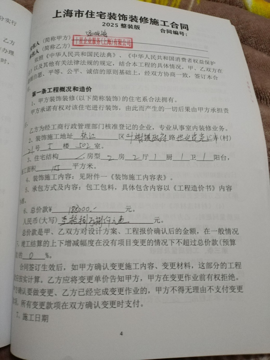 裝修地址:上海市松江區(qū)葉榭鎮(zhèn)世紀(jì)花苑三村21棟502室,建筑面積101平,室內(nèi)面積我也不懂。宣傳的是十星裝飾王boss從事十一年家裝公司,簽合同的是2024年成立的公司十星企業(yè)服務(wù)(上海)有限公司