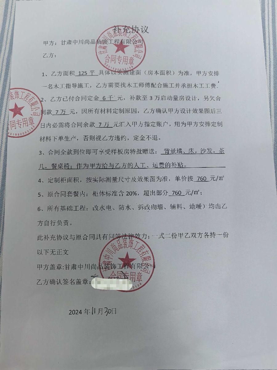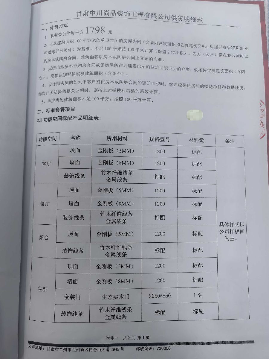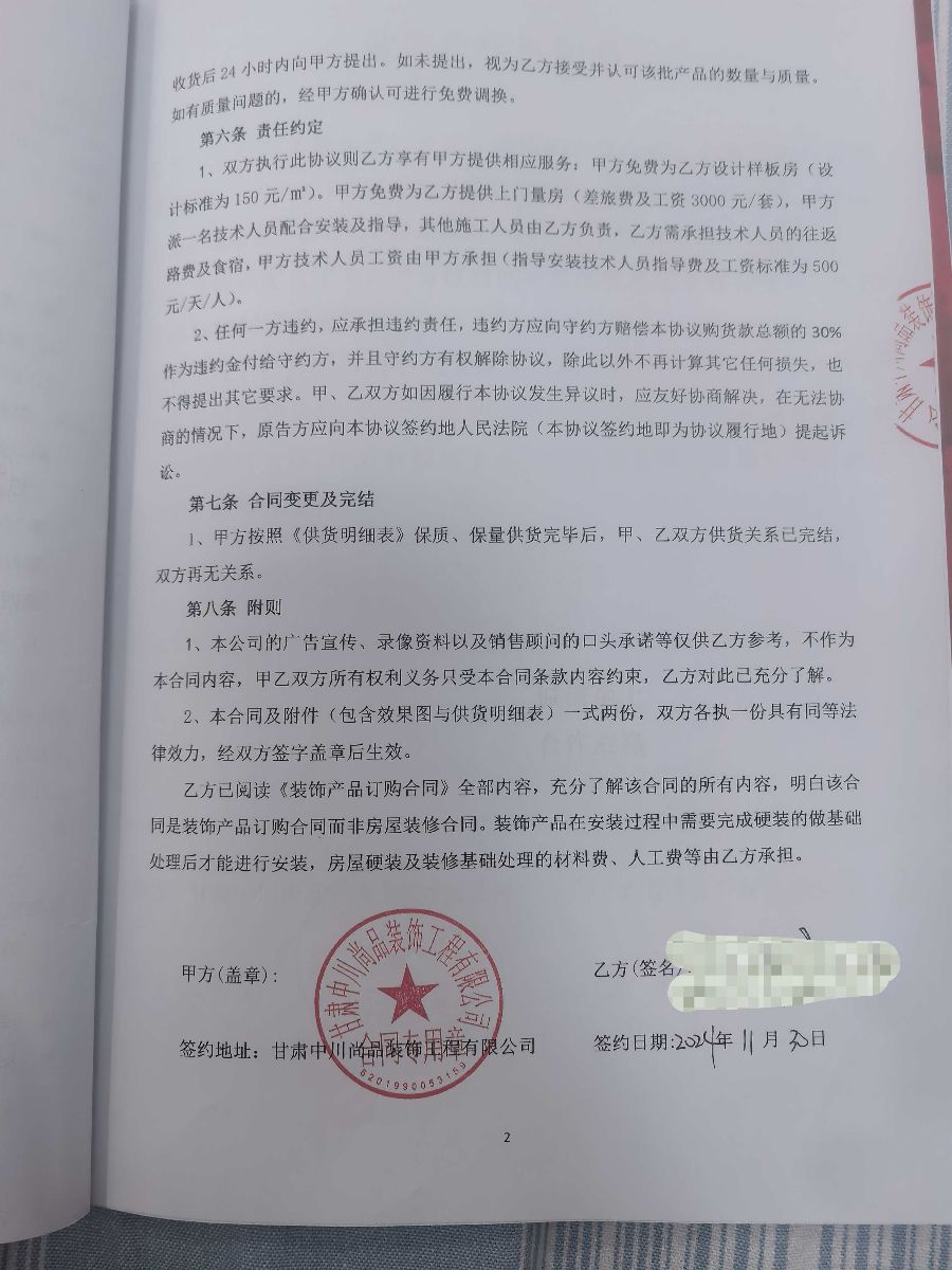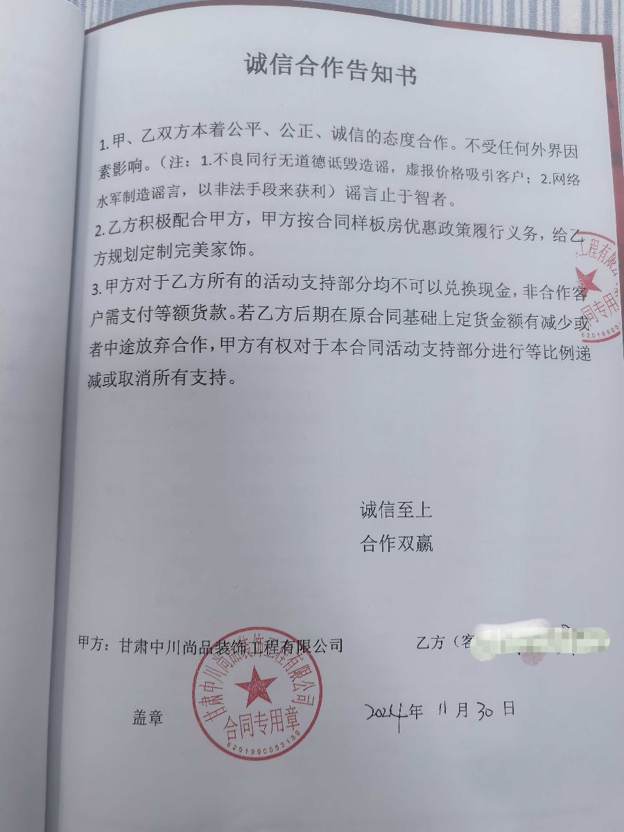 先開始的時(shí)候就從網(wǎng)上看到他們公司的廣告,他們說無(wú)異味,價(jià)格便宜,裝修快,就去現(xiàn)場(chǎng)看了一下,感覺還可以,后面就簽了訂金合同,因?yàn)榈谝淮谓佑|這個(gè),其實(shí)他們就簽了一個(gè)“材料訂購(gòu)”合同,根本不是裝修合同。