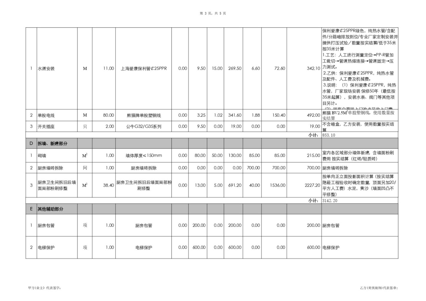 (1)、砌墻(1項,215.00元): 原始預(yù)算中無此項目,屬于新增墻體工程。我方未就新建墻體的位置、尺寸、費(fèi)用等進(jìn)行過書面確認(rèn)。