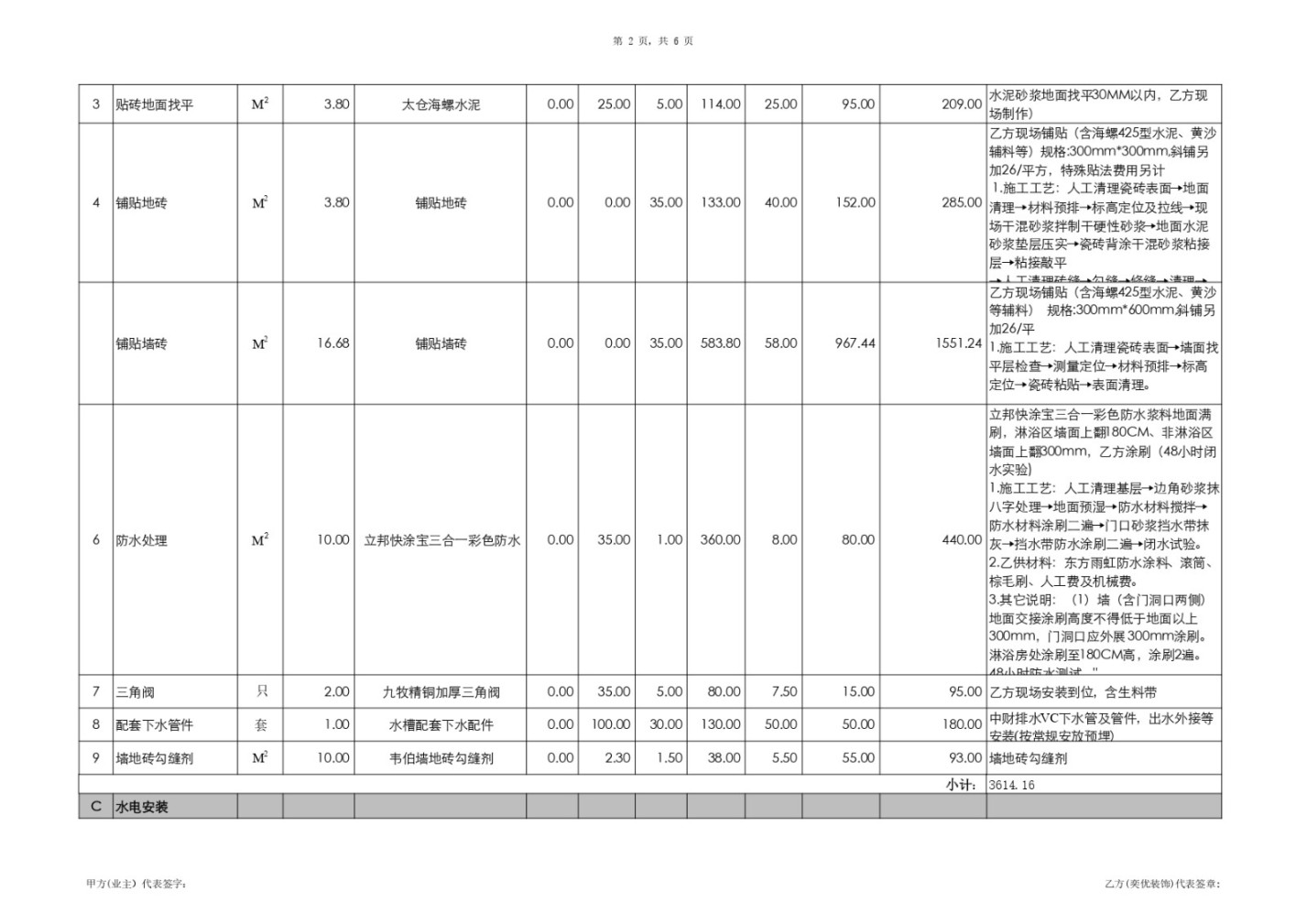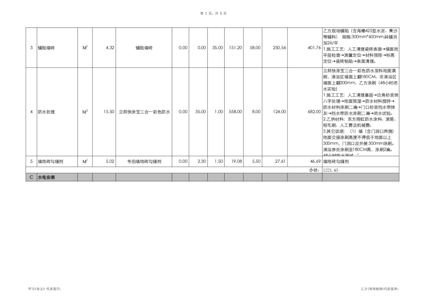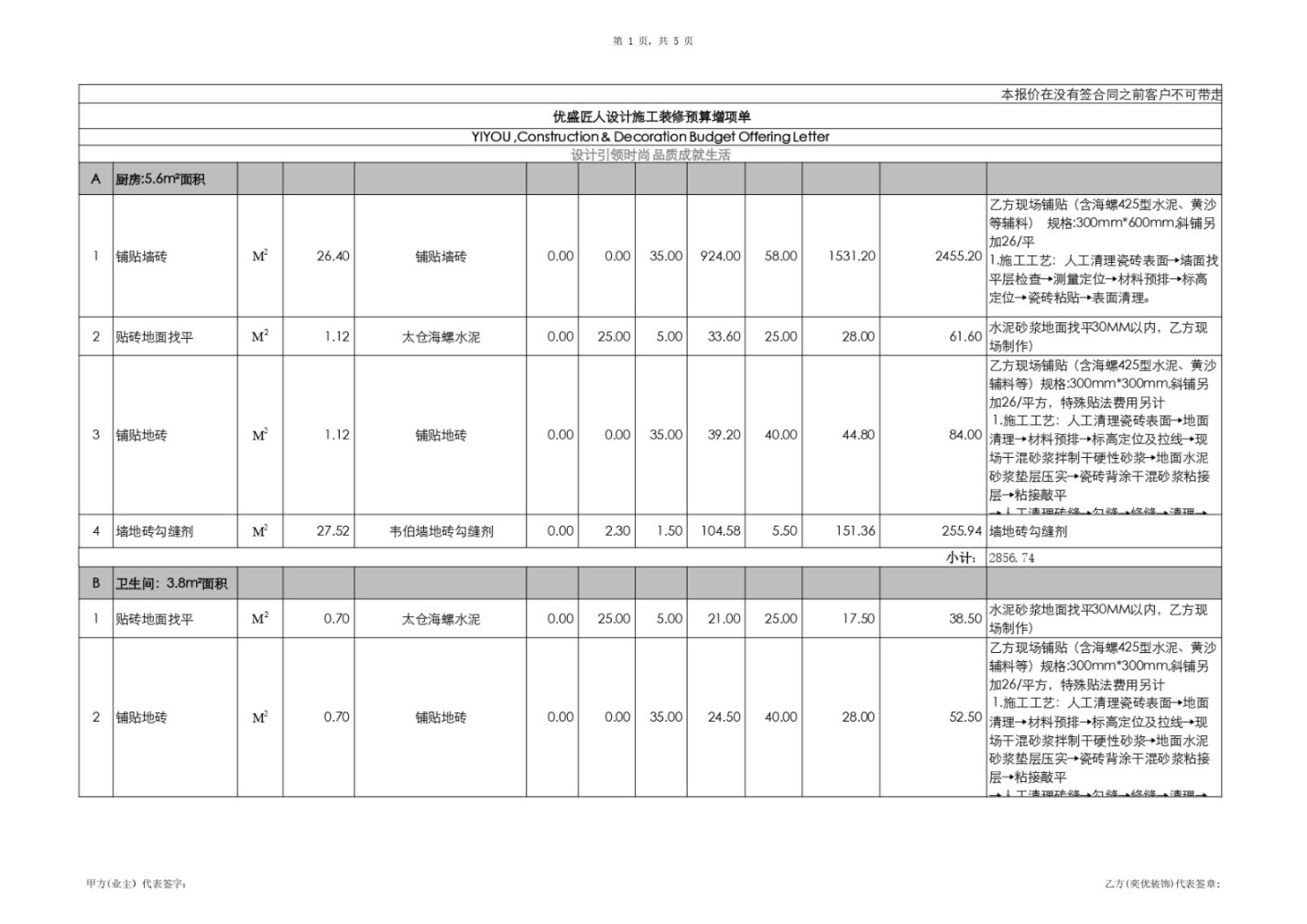 證據(jù): 原《預(yù)算書》(文檔2)第1頁A-1“鋪貼墻磚”及第2頁B-4“鋪貼地磚”的工藝說明中,白紙黑字明確承諾“含海螺425型水泥、黃沙等輔料”。