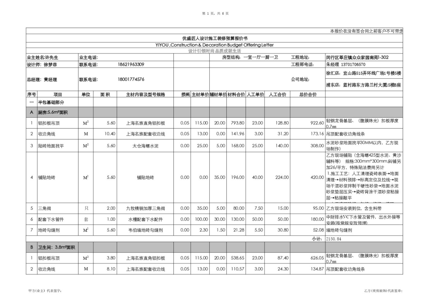 與上海奕優(yōu)建筑裝飾有限公司于2025年底簽訂的【眾眾家園南苑1-302室廚衛(wèi)間改造】裝修合同。目前項目已基本趨近于完工,針對該公司于工程后期提出的《裝修預(yù)算增項單》(總計14,373.60元)和基礎(chǔ)預(yù)算報價方案及相關(guān)結(jié)算方式,經(jīng)審慎核查,發(fā)現(xiàn)其中存在大量未獲事前書面確認(rèn)的施工增項、極不合理的工程量計算、違反多項法規(guī)的合同條款以及涉嫌違規(guī)的稅務(wù)操作等問題。