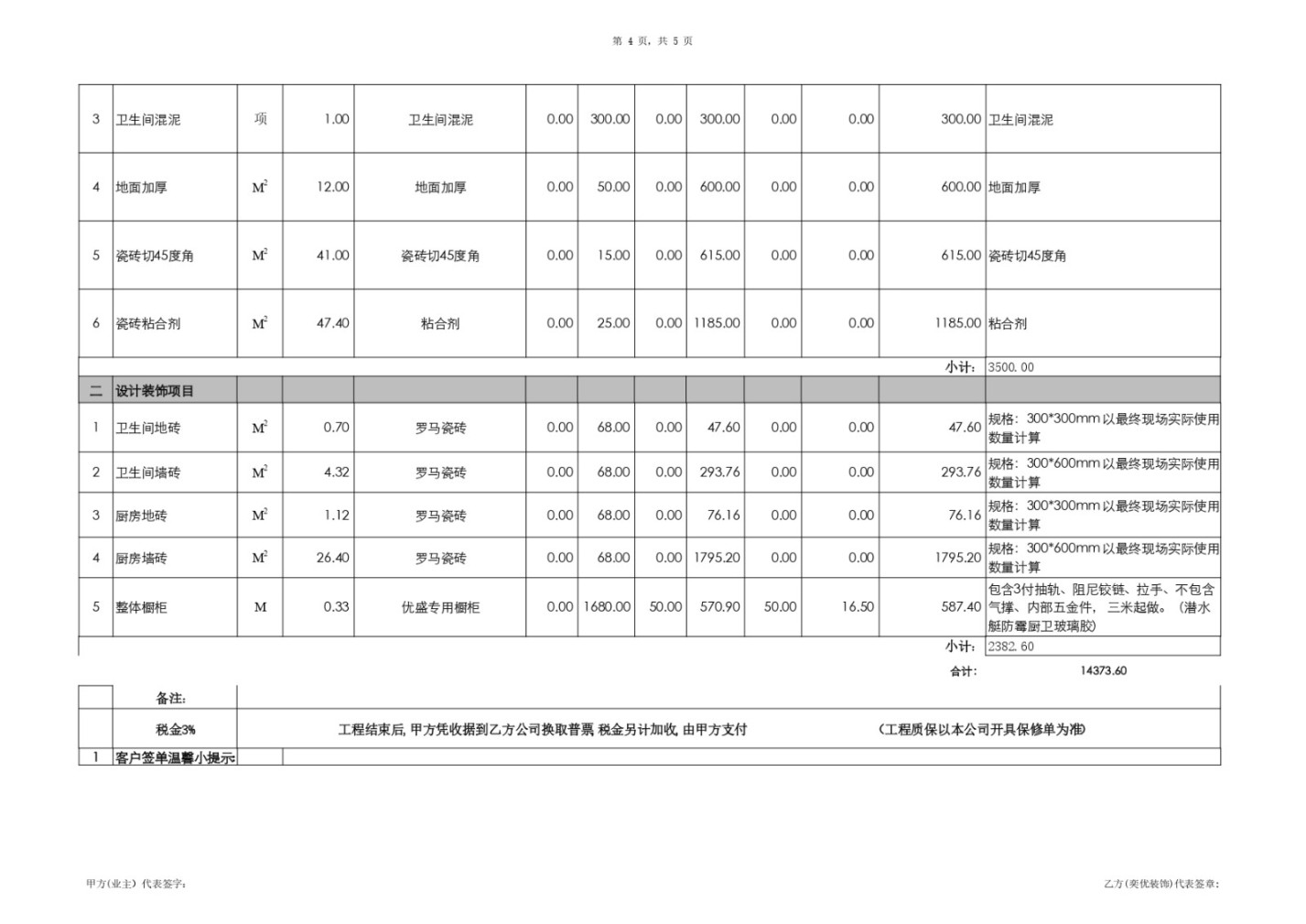 具體問題:增項單中“整體櫥柜”的主材單價從1,580.00元/米上調(diào)至1,680.00元/米。在未明確說明型號、規(guī)格變更的情況下,單方面提高單價缺乏合理依據(jù)。此外,部分瓷磚單價也從58元/㎡漲至68元/㎡。