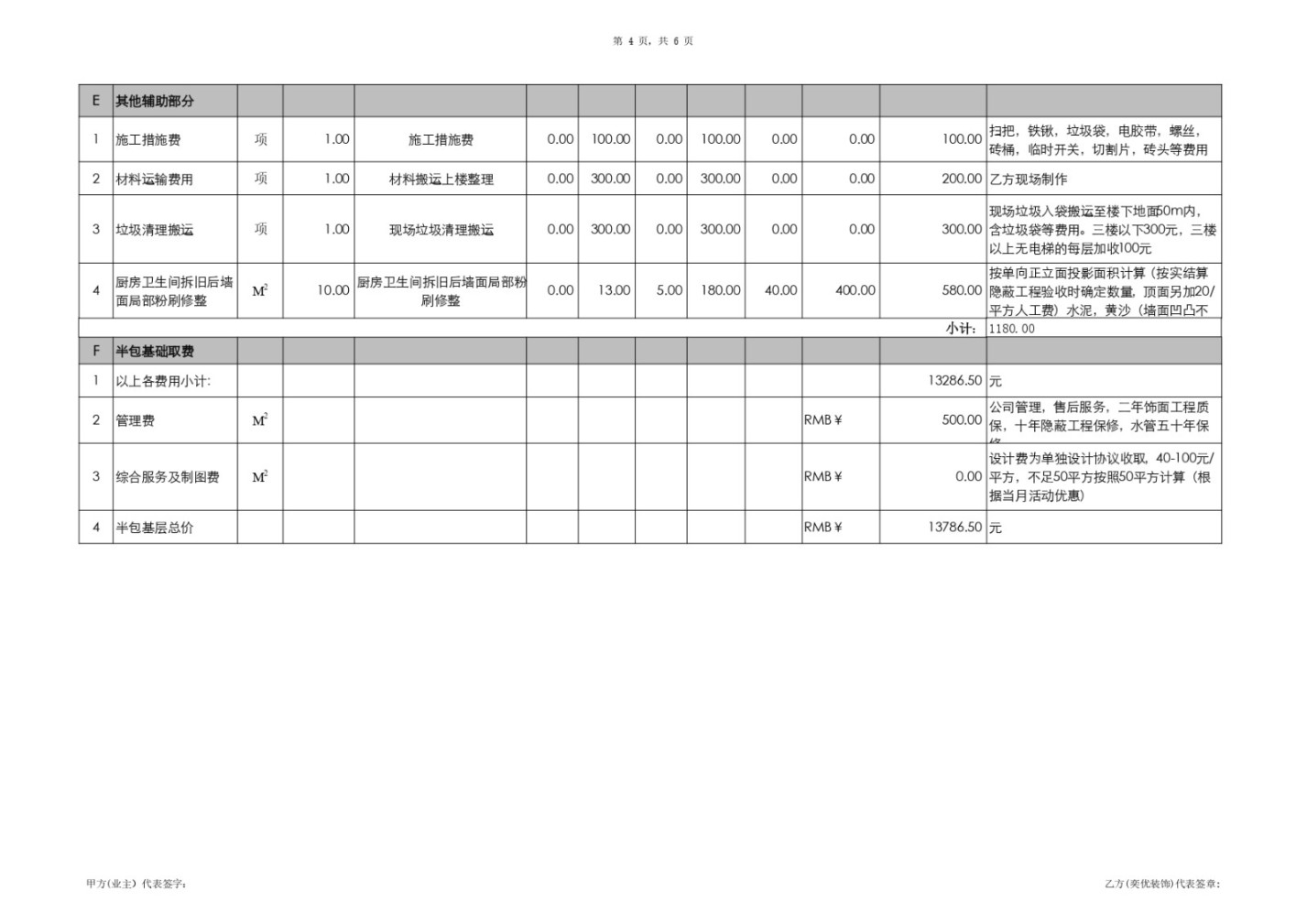 數(shù)據(jù)對比: 廚衛(wèi)合計面積約9.4㎡(5.6+3.8)。原始預(yù)算中,“拆舊后墻面局部粉刷修整”為10㎡,備注“按單向正立面投影面積計算”。而在增項單中,此項面積變?yōu)?8.4㎡,費(fèi)用2,227.20元。