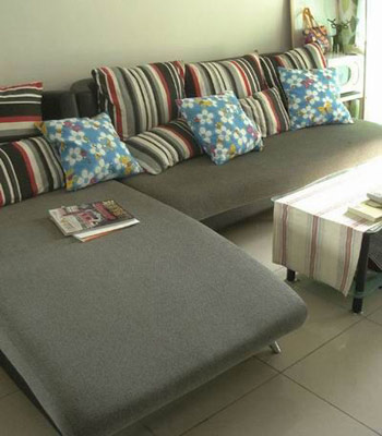 扮家心得:家是點滴積累的,平時多逛逛家居商場,多積累些小飾品比較好,一次性購買往往會時間太緊迫。 L型沙發(fā)加條紋抱枕共1500元,原價2800,樣品再砍價,1500就拿到了,當時買得比較急沒有細選,覺得占面積太大了,但是大有大的好處,橫七豎八都可以躺。