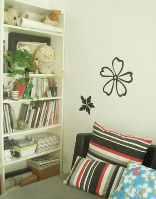 客廳一角,宜家買的書柜,約500元。大鏡子是朋友送的。三盆綠植共40元。 最值的是墻體改造,才花8塊錢,用涂料和壁紙劃不來,不花心思又覺得不好看,于是便買了一卷25元的黑色不干膠紙,花紋是手繪后剪好貼上去的,看膩了可以撕下?lián)Q新圖案。只用了三分之一的紙。