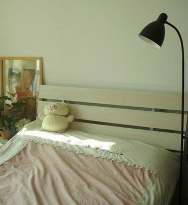 金屬落地燈,在家之福建材市場選的,砍價至135元。 小桌子旁就是一個大落地窗,窗外是陽臺,養(yǎng)了些花,小桌子是宜家的,70元,上面的微波爐是我購物中獎得來的,沒花錢。