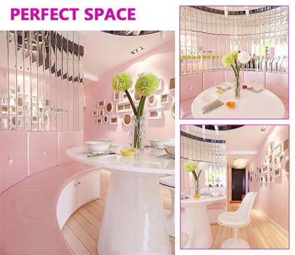 粉色的餐廳,它的設(shè)計(jì)同廚房相結(jié)合。以節(jié)省空間,餐椅制作為固定的一排,亦可作為收納空間,可以很實(shí)用,又會(huì)很美觀。