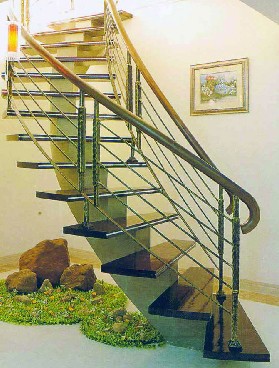 弧梯——現(xiàn)在還有一些復(fù)式房用這種設(shè)計,但這種設(shè)計只適合大型的復(fù)式房?;⌒挝⑿蛏系氖覂?nèi)樓梯,較之前者占地面積略大,顯現(xiàn)出美感韻味也多,能活躍室內(nèi)氣氛。由于弧形的特性,造型方面可更大膽、夸張,特別在色彩上無論是用近似色,與室內(nèi)色彩統(tǒng)一,還是取對比色調(diào),造成強烈反差,均可達到滿意優(yōu)美的效果,能使之產(chǎn)生豪華氣派。
