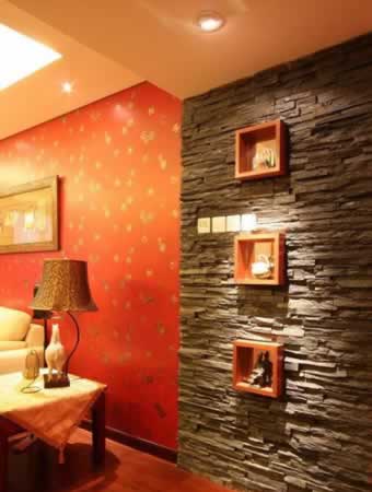 木與石的對比,柔硬并存;方與圓的穿插,虛實相間??蛷d背景的旁邊,用自然氣息的文化石和三個方型的中式木雕格子作裝飾,貴氣而不失靈巧,不由眼前一亮。