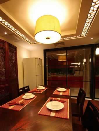 紅檀木餐桌是整個餐廳中的亮點,邊上的胡桃木酒柜無論顏色、款式還是做工都與餐桌非常匹配。再搭配上一盞圓形的羊皮燈,“天圓地方”正好應(yīng)和了中國傳統(tǒng)的寓意。