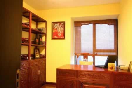 書房采用了明清家具配重蟻木地板的古典中式風(fēng)格,幾只精細(xì)的門環(huán),讓粗樸、厚重的柜子頓時變得輕靈起來,整個家顯得莊重沉穩(wěn)卻不繁瑣。