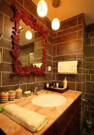 衛(wèi)浴間的瓷磚也依照中式的墻面貼合方式,再配上木雕的鏡子,熟悉的衛(wèi)浴間也多了些許別樣韻味。