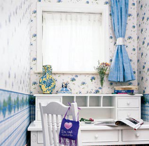 目前,壁紙的設計開始區(qū)域化,有專門為客廳、書房等室內不同區(qū)域設計的壁紙。有條件的話,按照壁紙的花色配搭一些簡單家具,會提升裝飾效果。