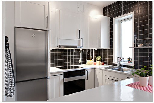 廚房的裝修不適宜用過多的顏色去裝飾,這樣只會讓廚房顯得更凌亂,以白色為主色,用一些暗色作為搭配色,整體給人感覺簡約干練。