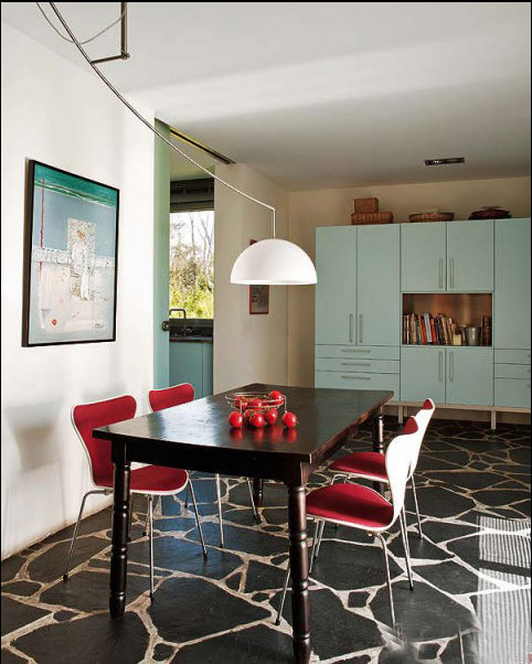 一個舊舊的木質(zhì)餐桌配紅色的座椅,讓人看著就覺得不侖不類。不過,這就是MAIK,他喜歡,他說坐在上面吃飯才有心情。