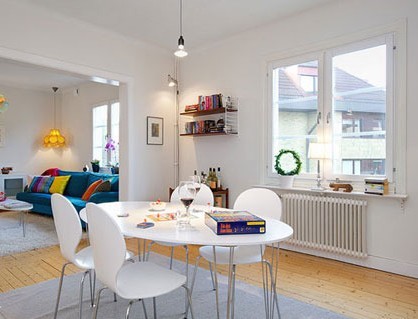 餐廳與客廳打通,客廳明艷的時尚色彩搭配。襯托出線條洗練的木質(zhì)餐桌和座椅,頗具北歐風(fēng)情,也讓整個餐廳看起來更加簡潔恬淡。桌上暖意色調(diào)的餐具,和亮麗的沙發(fā)區(qū)相映成趣,整個空間被拉進(jìn)一個活潑溫馨的氛圍中。