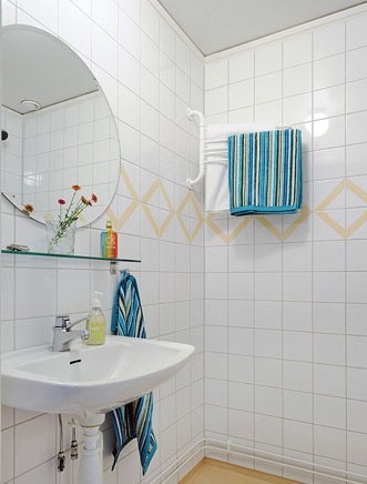 衛(wèi)浴空間的設(shè)計簡潔而明快,體現(xiàn)了現(xiàn)代人的品味。清新的藍(lán)色、黃色點(diǎn)綴呈現(xiàn)出清爽明凈感,小部分花磚的墻面拼貼在細(xì)膩中展現(xiàn)出不凡的品質(zhì)感,營造出純凈的自然氛圍。擱架的處理提供了良好的收納裝置,是裝飾,也是實(shí)用家品。讓空間顯得非常舒適。
