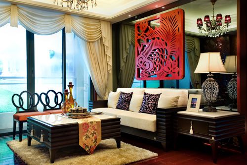客廳沙發(fā)背景墻的剪紙藝術(shù)設(shè)計(jì),室內(nèi)裝飾品擺設(shè)著民間漆雕工藝,及琉璃和仿古家私都展示出中式風(fēng)格設(shè)計(jì)風(fēng)采。