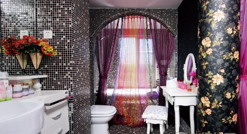 暗色的馬賽克與純白的洗浴設(shè)施,制造出鮮明的個人特色。黑色花紋的柱子中其實隱藏了洗浴間的管道。
