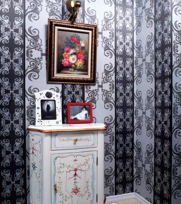 黑色花紋壁紙及圓形立柱散發(fā)出獨特氣味,純白色家具、紫色窗簾在深色中增添居室亮度。