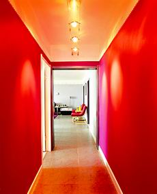 大膽地應(yīng)用了亮紅色,一進(jìn)門就可以感覺到濃濃的暖意,但設(shè)計(jì)師建議在走廊的兩邊懸掛主人的一些有回憶的照片,增加一下情調(diào)。
