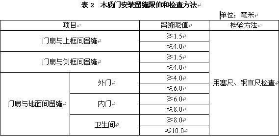 ——檢查門套與扇截口及門套線結(jié)合處高低差;門扇與門框、扇與扇接縫高低差是否符合表2中的要求;門扇與上框、側(cè)框、地面間留縫是否符合表2要求。