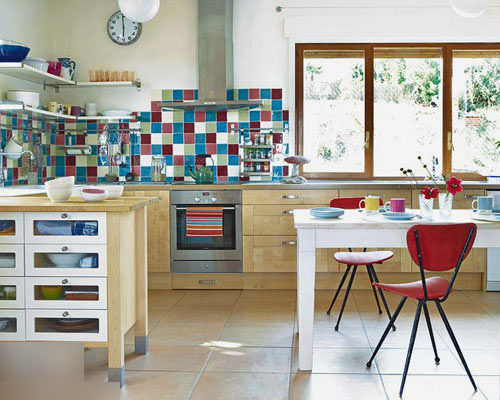 原木色和白色搭配的廚柜,給人整體淡然的設計感;整潔的流理臺面帶給人以高品質的追求;櫥柜臺面的彩磚背景墻營造出豐富的空間層次感。