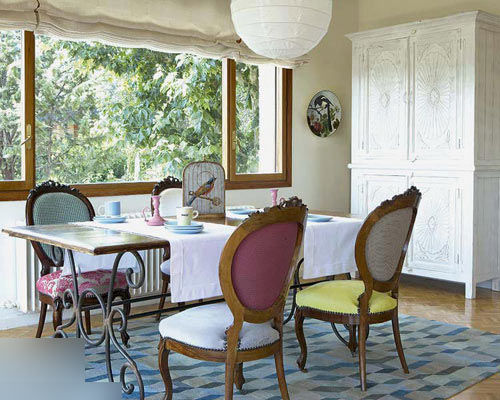 餐廳的配色濃淡相間,家具、家飾的造型更顯古典與內斂,餐桌后的壁柜也極具特色。手工描金的邊柜為餐廳增添了華美秀麗之感;大玻璃窗的光影,增加了餐廳的空間動感。