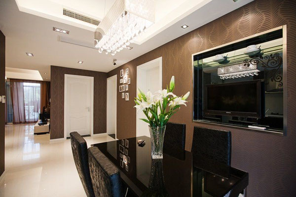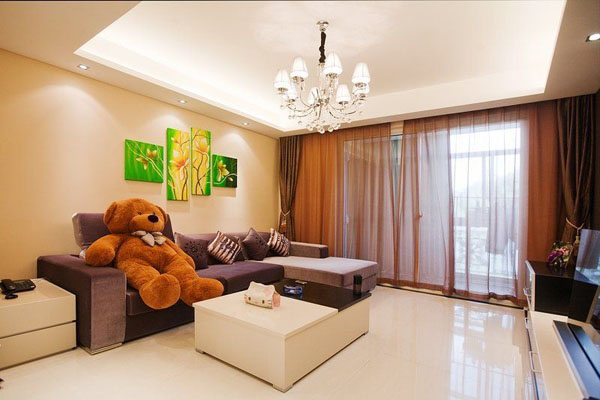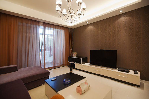 客廳的墻面,窗簾及布藝沙發(fā)以咖啡色及紫色系列。讓充滿現(xiàn)代感的簡約空間里多了一些浪漫溫馨。