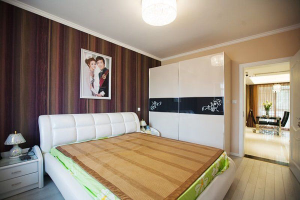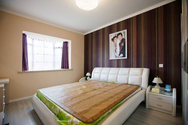 臥室里軟裝還沒有進場,我們就先來拍一些圖。臥室的背景墻用堅條紋的墻紙,衣服是宜家買的,床頭柜也一樣,這個比木工做要美觀許多。