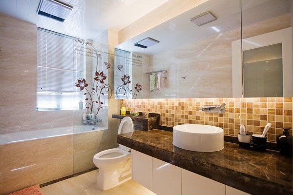 衛(wèi)生間里裝修以現(xiàn)代風主,咖啡的大理石臺面襯托著潔白的臺盆,浴缸與馬桶以一扇強化玻璃做形式的隔開。