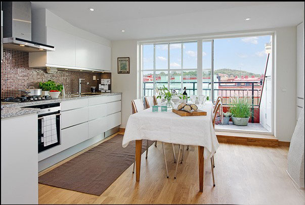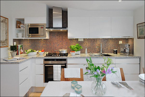 開放式的廚房很能挑戰(zhàn)主婦的清潔力度,這里白色的櫥柜同馬賽克的花色形成了鮮明的對比。