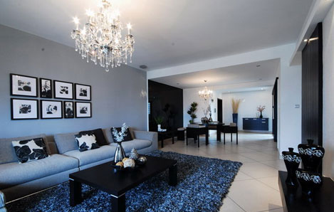 客廳:窗簾、地毯與整體格調(diào)一致的灰黑色,水晶燈給人奢華的感覺??蛷d與餐廳相連,視覺上顯得很大。