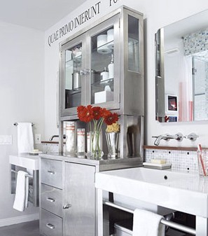 亮光的不銹鋼浴室柜搭配同樣高亮的白色潔具,相同的質(zhì)感為浴室?guī)?lái)酷勁十足的個(gè)性元素;同時(shí)花卉的點(diǎn)綴能中和空間里的冰涼感。