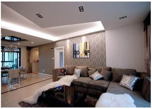 玄關(guān)處壁紙一直延伸到客廳沙發(fā)背景墻??蛷d棕色的沙發(fā)與墻紙色調(diào)一致。白色皮草及銀色靠枕,第一時(shí)間跳出大家的視線,有種小華麗的感覺。餐廳與客廳之間用了一圈?;u走邊,區(qū)分了客廳和餐廳的空間。