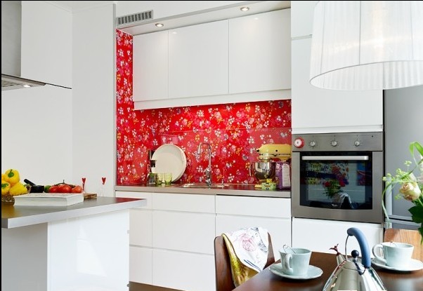 沙發(fā)背景墻的裝飾畫是比較典型的北歐現(xiàn)代藝術(shù),與廚房背景面的那抹艷麗紅色相互對應(yīng)著。