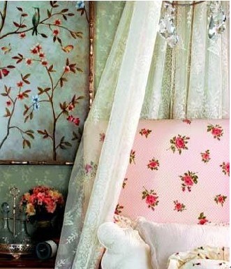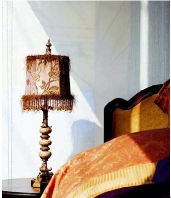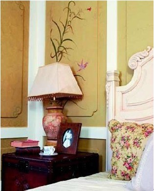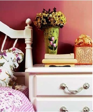 八,紗帳營造的浪漫。如果你覺得床頭柜上放臺(tái)燈、蠟燭、鮮花,以及在墻上掛畫之類的床頭裝飾基礎(chǔ)法則都不夠浪漫,那么,試試看為你的床頭披上一襲白紗。把白色通花紗帳的頂部在天花板上固定好,再將紗幔的大部分塞到床靠后面,只留一小部分自然下垂于床頭,調(diào)整一下紗帳的形狀,讓床頭半隱半現(xiàn)就可以了。