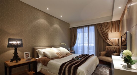 淡雅的軟裝配飾在后期的整合中是很重要的,本案臥室的色調(diào)以淡咖啡色為主色系,床被的白色系與白色電視柜則中和了咖啡色主色系,也使室內(nèi)的環(huán)境更加潔凈雅致;