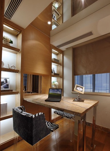 原木色系與書架上的精致裝飾品很好體現(xiàn)了主人的不俗的品味;時尚款式的椅子,異型的書桌更顯示了主人的獨(dú)特氣質(zhì);