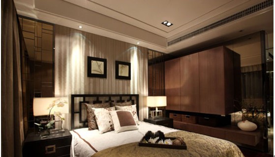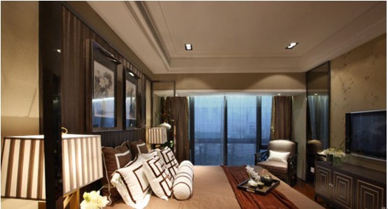 臥室的光與影、剛與柔,打破喧囂與沉靜,冷暖、深淺對(duì)比的設(shè)計(jì)語(yǔ)言,傳達(dá)了傳統(tǒng)與現(xiàn)代交匯的新東方主義概念,
