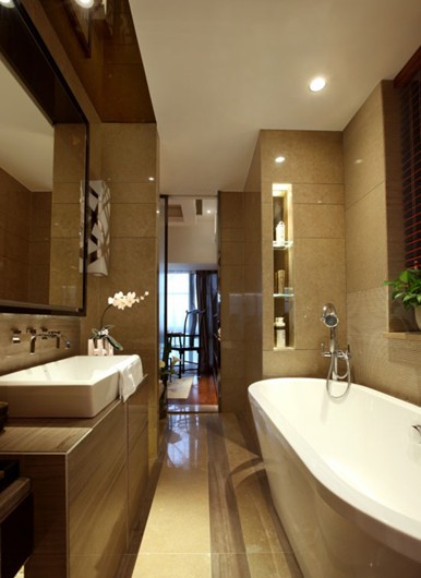 衛(wèi)生間洗手間狹長(zhǎng)而整體,它是連接主臥、書房的重要空間,也是空間通透;