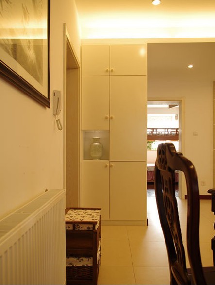餐桌椅也是裝修前家里就有的,在這里被賦予了新的生命。為了配它,特地選購了后面的水墨畫,畫框是在當(dāng)?shù)囟ㄖ频摹U脫踝∨潆娤?。進門的玄關(guān)柜是白色的。