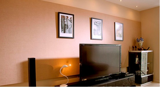 電視墻上的照片用數(shù)量的有序排列來達到美感,以簡單造意;