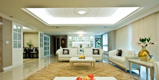 歐式中的白色家具是所有裝飾中比較洋氣的,也是比較討巧的裝飾,白色是神圣典雅的;白色大尺寸石膏頂角線條,局部白色吊頂燈帶,具有不對(duì)稱的美感;