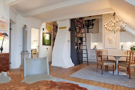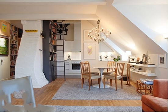 空間不大的小家里融合了LOFT元素的設(shè)計(jì),將廚房、餐廳和閱讀角打造于一體。通天的書架劃分出物質(zhì)和精神食量?jī)纱髤^(qū),家具深淺色調(diào)的變化為白色空間帶來(lái)一絲新意。
