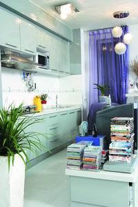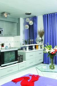 真正進了屋,一定要驚訝她的客廳居然一半是廚房。她的家中你找不到廚房,客廳就是廚房。電視機和長形吧臺為界,將廚房與客廳隔開?;疑奈魇綑还裾紳M客廳的一面墻,鍋碗瓢盆樣樣齊備。詹曦自豪地介紹,客廳原本很小,進門的儲物間與廚房并列,她就將儲物間拆了,把廚房納入客廳,這樣廚房與廳連為一體,既是客廳又有廚房,寬敞明亮,本想更大膽地將客廳墻也拆了,將臥室也納入進來,可惜工人說客廳的墻是承重墻不能打,只好做罷。